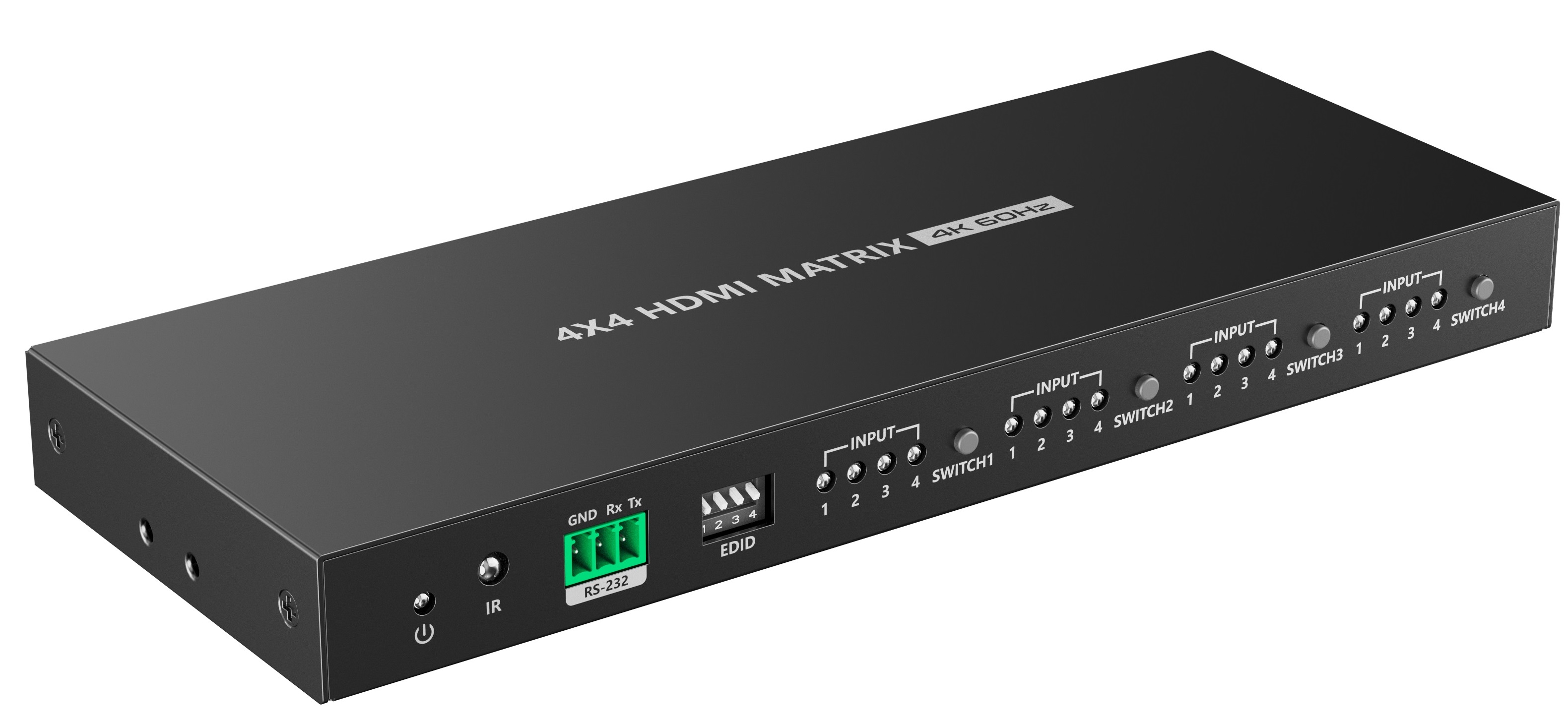 This is a 4 in 4 out HDMI matrix switch, it can switch 4 HDMI input signals to 4 HDMI displays as needed. It supports up to 4096x2160@60Hz HDR UHD resolution, and a variety of switching methods (IR remote control, buttons and RS232).