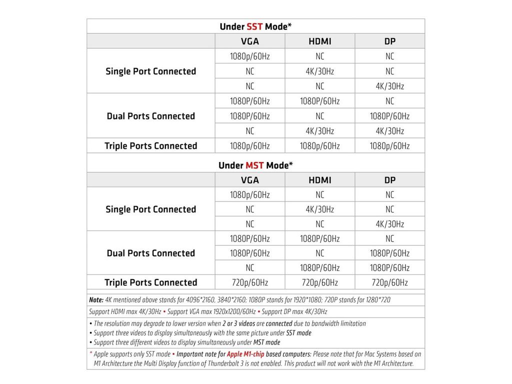 | Max Resolution Details | 4K - 30 Hz (HDMI only) ¦ 4K - 30 Hz (DisplayPort only) ¦ 1920 x 1200 - 60 Hz (VGA only) |