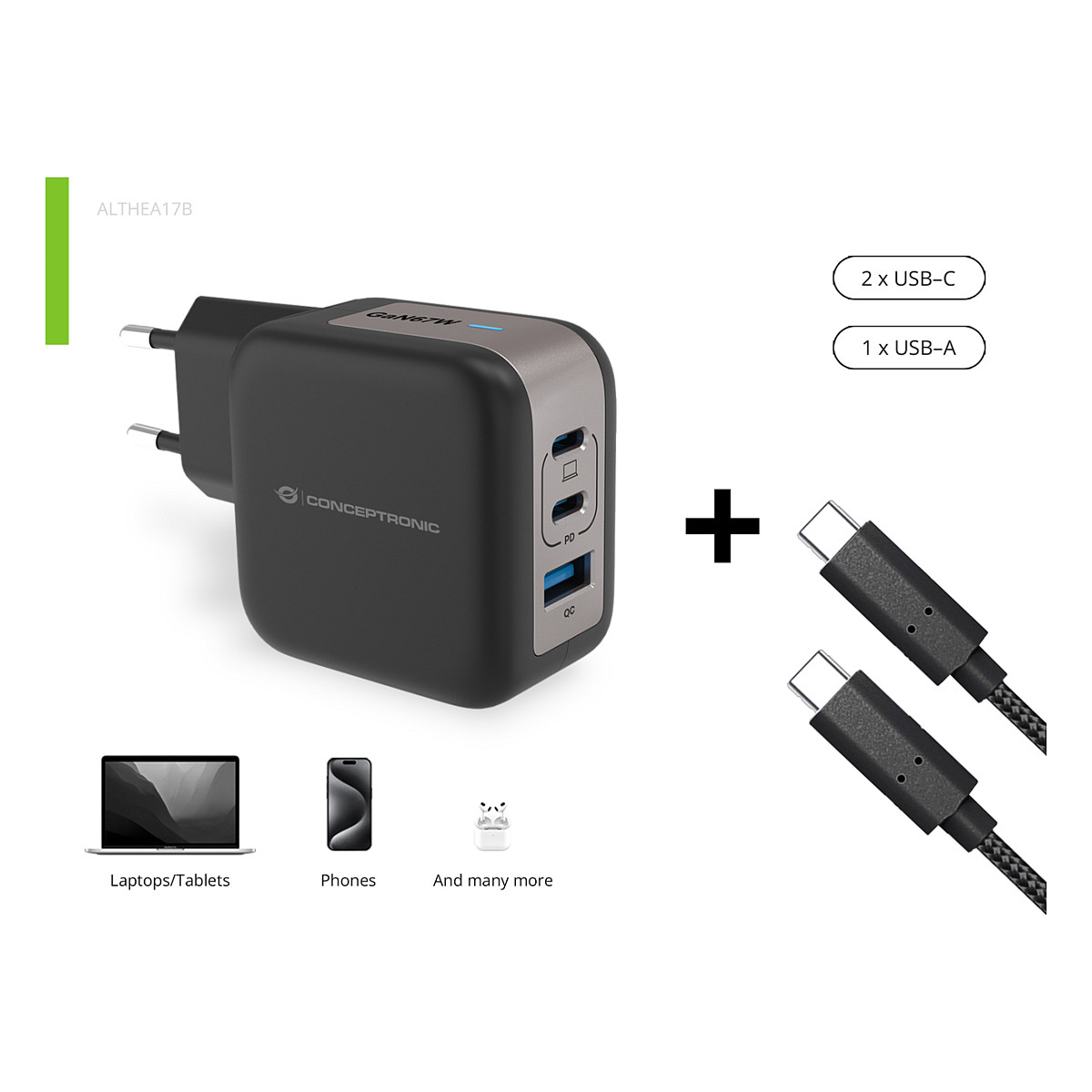 CONCEPTRONIC Ladegerät 3Port GaN 2xUSB-C/1xA 67WPD3.0/PPS sw