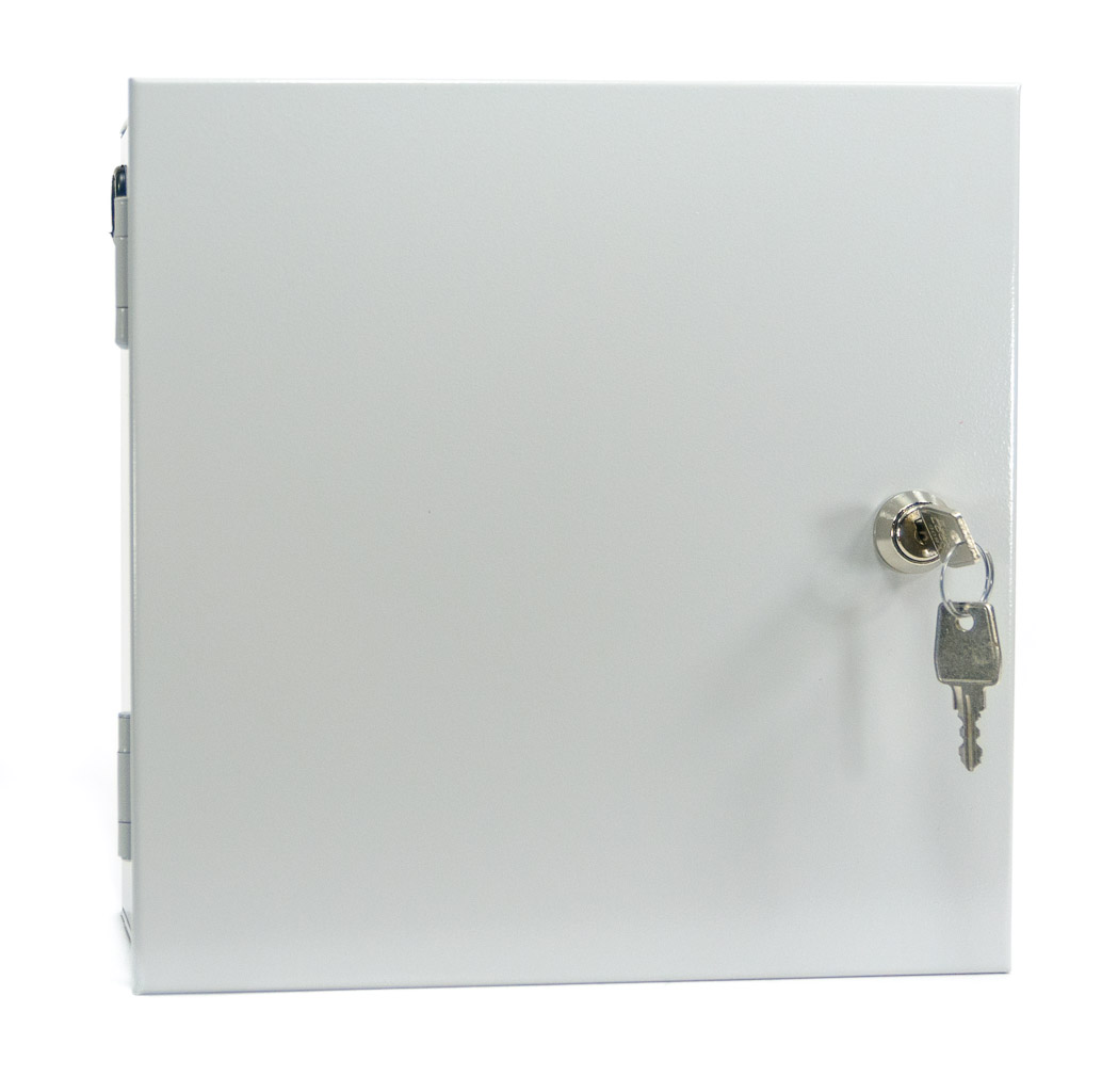 The offered product is a fiber optic switchboard adapted for wall mounting. It is made of 1 mm thick steel sheet and painted in light gray RAL7035. External dimensions are 255 x 255 x 101 mm.
