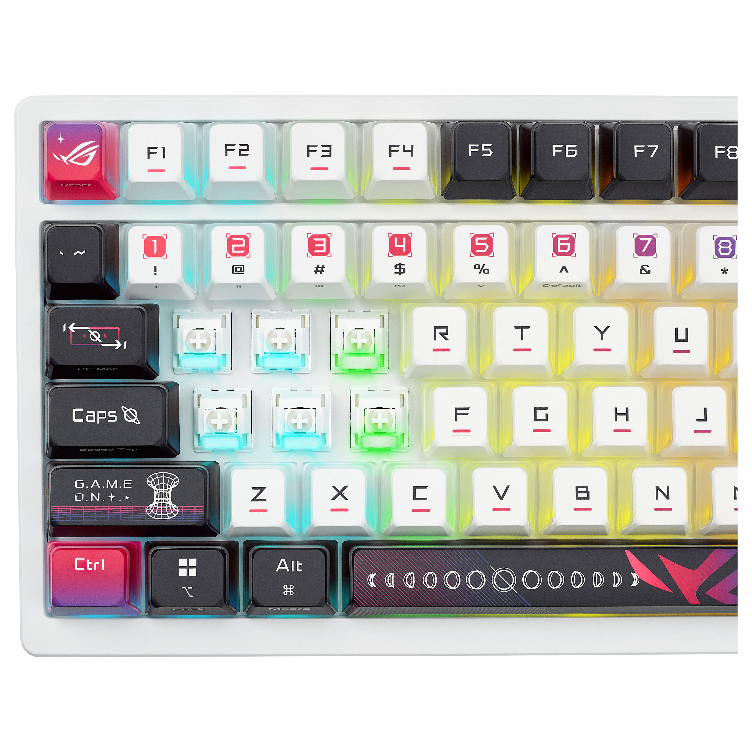 The ROG Azoth X is a 75% custom gaming keyboard built for discerning gamers and keyboard enthusiasts who demand precision and versatility. It features hot-swappable ROG NX V2 Mechanical Switches and dye-sublimated Stellar-themed ROG keycaps for enhanced durability and aesthetics. A south-facing PCB ensures compatibility with a broad range of switches and keycaps. while five dampening players. a gasket mount. and an FR4 positioning plate work in unison to provide refined typing experiences. The Azoth X boasts an OLED display with intuitive controls. tri-mode connectivity including 2.4GHz ROG SpeedNova technology. a silicone wrist rest. three tilt angles. and Mac support.